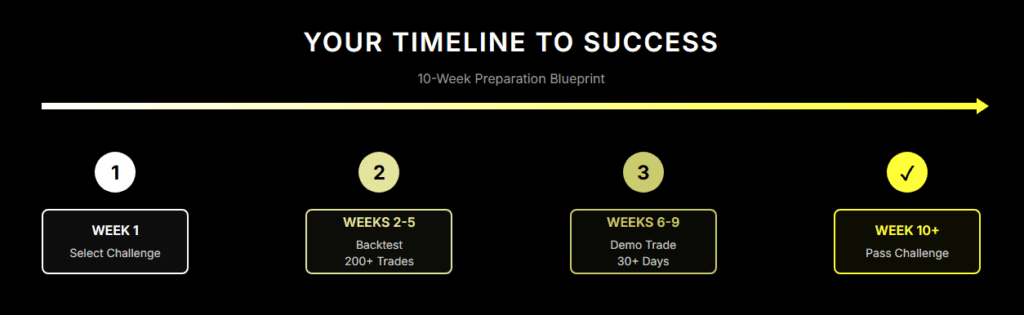 Week 10+: Purchase your challenge only when demo results prove 30+ days of consistent rule-following. Execute with confidence.