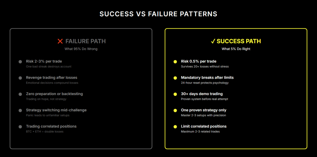 Conservative risk controls prevent failure—traders pass by risking 0.5%, not by finding perfect setups.